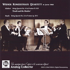 1960年に来日したウィーン・コンツェルトハウスSQが東京で残した録音の復刻だ。レパートリー中でも絶対的であつたハイドンとシューベルトが聴けるのが嬉しい。モーツァルトやブラームスも良いが、矢張り相性が格段に違ふ。死と乙女の解釈はウエストミンスター録音とほぼ同じだが、当盤は一発録りの感興があり昂揚があつて素晴らしい。滴るやうな詠嘆が聴けるのはコンツェルトハウスSQの醍醐味だ。ハイドンは墺プライザーの放送録音集でも聴くことが出来た。当盤は後半楽章が幾分散漫で残念乍ら感銘が落ちる。(2025.11.30)