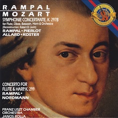 CBS録音全集56枚組。ランパルはK.299をCBSにはノルドマンとの1回しか録音してゐない。ラスキーヌとの録音が有名だが、ノルドマンとの共演は安定志向が強く、完成度が高い一方で面白みは少ない。さて、話題となつたレヴィン版協奏交響曲のPhilipsレーベルによる初録音はドイツの名手たち―ニコレ・ホリガー・バウマン・トゥーネマンによつて成されたが、ランパルが手を拱いてゐる訳がない。フランスの名手を取り揃へて対抗盤を作成した。大らかで華やかな演奏は屈託がなく、ランパルが存分に楽しんでゐる。これはこれで良い。さて、クレジットではバソンがマルセル・アラールと表記されてゐるが、この奏者のことは委細不明で、モーリス・アラールの誤記なのではないかと思ふ。真相を求む。(2025.10.21)
