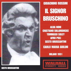 1951年9月24日の記録。ブルスキーノ氏の全曲録音は数種しかないが、若き日のジュリーニに録音があるとは驚きであつた。ジュリーニは最初、忘れ去られた作品を復活上演するのに取り組んだ挑戦的な人であつた。しかし、報はれないといふか旨味がないことを知つたのか、保守王道的な傾向を強めて、レパートリーもドイツ系寄りになつて仕舞つた。だが、この頃のジュリーニは面白い。スカラ座の好演もあつてイタリアの音楽を堪能出来る。歌手も粒揃ひ、特にガウデンツィオとブルスキーノ氏を歌ふブルスカンティーニとポーリが痛快だ。この作品は他愛もない笑劇―ファルサ―であるが、音楽はロッシーニの精髄で存分に楽しめる。(2025.10.30)