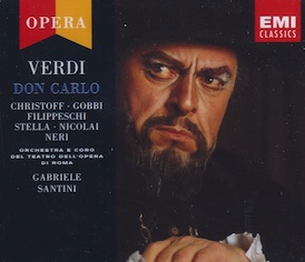 4幕版での1954年モノーラル録音。サンティーニは7年後の1961年にDG録音でも起用されてゐる。何とクリストフのフィリッポとステッラのエリザベッタもそのままなのだ。決定盤とされるDG盤はスカラ座とのステレオ録音で断然条件が良い。当盤でエボリ公女を歌ふニコライはコッソットに及ばない。大審問官のジュリオ・ネリもまたイヴォ・ヴィンコに及ばない。DG盤ではポーサ侯爵がバスティアニーニで決定的名唱を打ち立てた。当盤では役者ゴッビが気焔を吐く。だが、高邁なバスティアニーニと比べ、ゴッビは奸智に長けた役柄で真価を発揮する。悪役癖が抜け切らないのだ。手管を尽くした歌唱は天晴だが、生粋のバスティアニーニの声には太刀打ち出来ない。となると、EMI盤はDG盤の比ではないのかといふとさうでもない。標題役のフィリッペスキが理想的な名唱で、激する一方で懊悩する太子を若々しい艶のある声で表現し、見事主役を張つてゐるのだ。そして、当盤の顔はクリストフのフィリッポだ。圧倒的存在感。(2025.10.24)