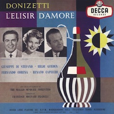ディ=ステファノ・デッカ録音全集14枚組。1955年の録音。ディ=ステファノがデッカに残した歌劇全曲は実はこの「愛の妙薬」だけで、他は提携関係にあつたRCAレーベルへの録音で歌手もRCA陣営が主軸を占める。純粋にデッカの歌手で制作された当盤には伝統的な欧州の息吹が強く残つてをり掛け替へがない。矢張りディ=ステファノが素晴らしい。小賢しさを抜きにして声の魅力を前面に出すので気持ちが良い。これぞネモリーノだ。1950年代迄は声の純粋さを保持してゐた絶頂期のギューデンのアディーナが得難い嵌まり役だ。ベルコーレにカペッキ、ドゥルカマーラにコレナを配置し贅沢だ。一聴して忽ち感じるのはモリナーリ=プラデッリの精気ある管弦楽の扱ひである。常套的なカットがあるが、オーケストラに関してはこれ以上ない決まつた出来栄えである。総合点において当盤が最高であらう。(2026.1.24)