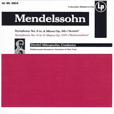驚天動地の偉業と絶讃したいミトロプーロス録音全集69枚組。1953年11月2日に纏めて録音されたメンデルスゾーン作品集だ。ミトロプーロスはスコットランド交響曲を十八番としてをり録音が沢山残る。正規録音も2種類ある。「嵐が丘」のやうな異常な解釈は不変で、聴き手に強烈な印象を与へる。最晩年のベルリン・フィルとの演奏が最も凄まじく、当盤もそれに劣らないが、幾分アメリカ的な粗さを感じる。宗教改革交響曲も同様で当盤は粗さが目立つ。晩年のケルン放送交響楽団との演奏の方が良い。終楽章コーダの改変には腰を抜かす。2つの序曲も激烈な情念が漏れ出した異形の名演。疾風のやうで唖然とする。(2025.10.9)